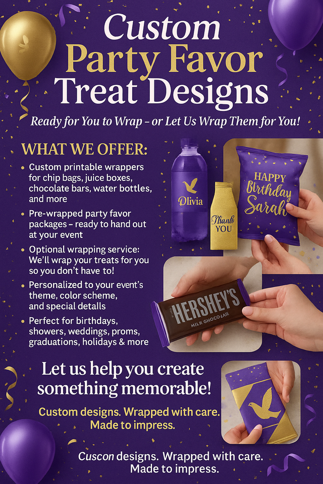 Your original snacks will go from ordinary to unforgettable when wrapped in our vibrant, thoughtfully designed packaging. Each wrap adds a splash of color and meaning, making your snack display more festive, eye-catching, and totally irresistible. Perfect for birthdays, baby showers, holidays, and party favors, these decorative wraps don’t just hold a snack—they create a memorable experience. Whether you’re celebrating big or just want to impress your guests, our custom designs make every treat pop with personality and charm.