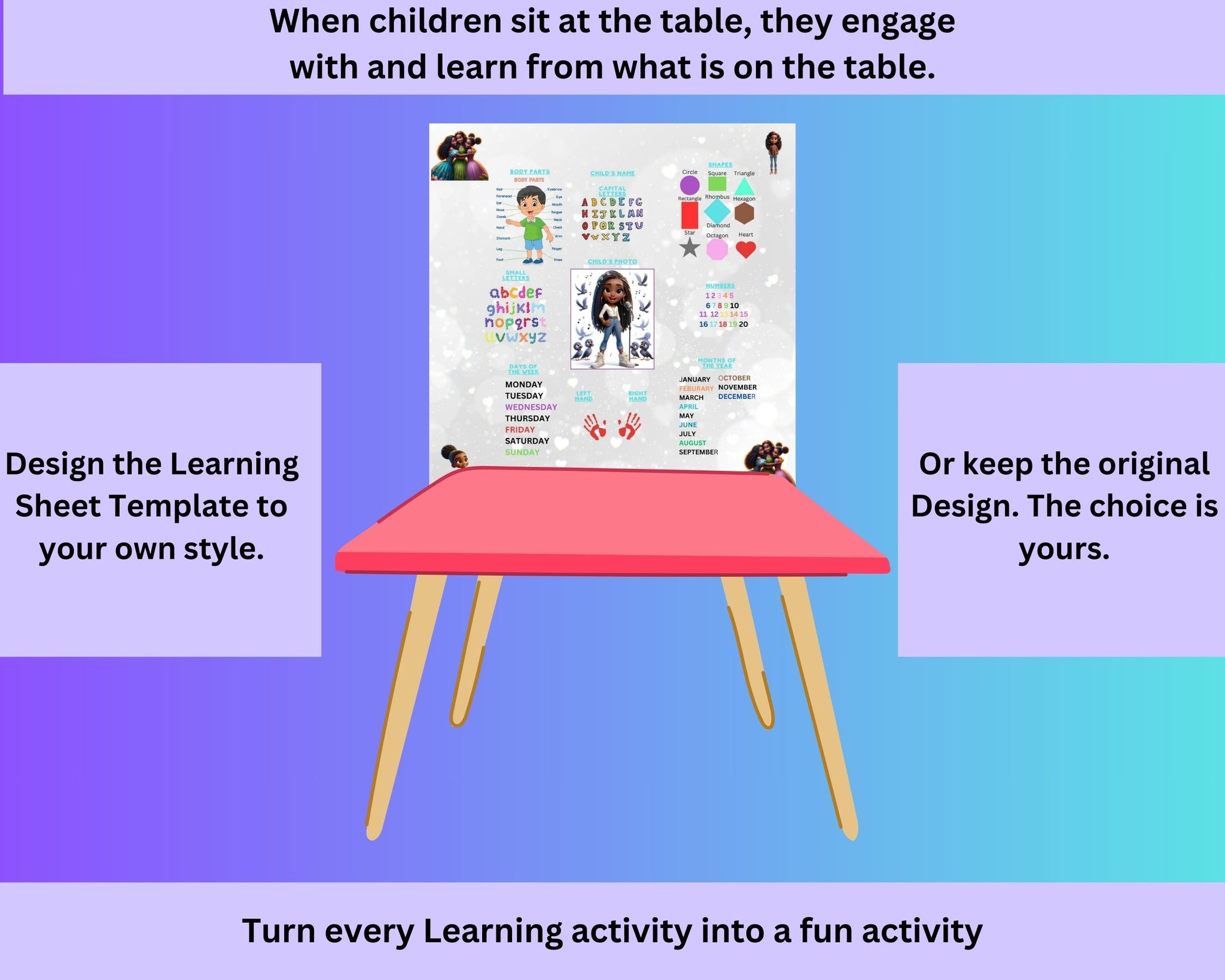 Learning Table: Editable Tabletop Learning Sheet Template you customize yourself or keep the original design. Perfect for having all of the basic learning essentials in one place. The children will stay engaged in this colorful and playful learning sheet.