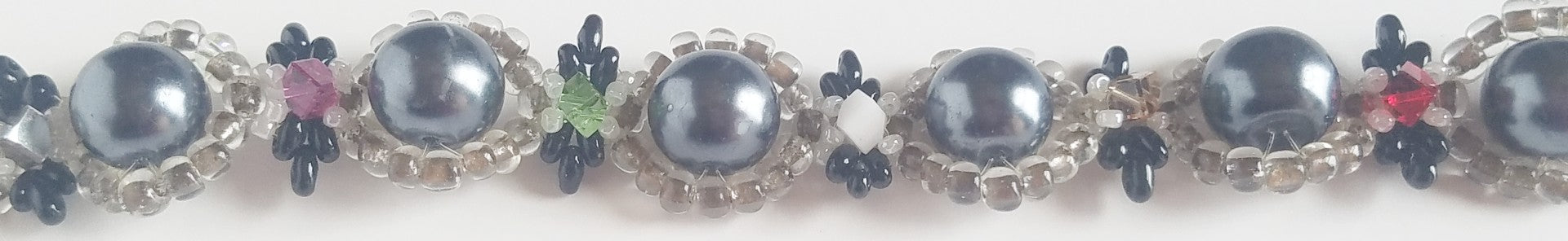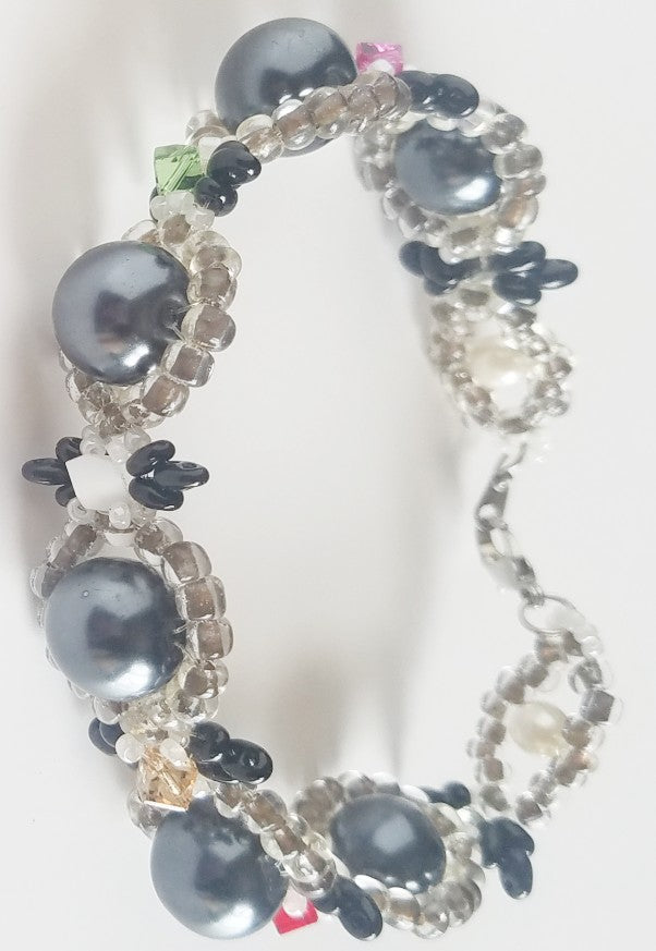This silver/grey faux pearl bracelet has an instant glow, trimmed with white and black beads and crystals. A must have! One of a Kind! I only made one of these and I will not be making anymore, so you will be the only one owning one. Comes with a Personal Message Card. Made with Love!