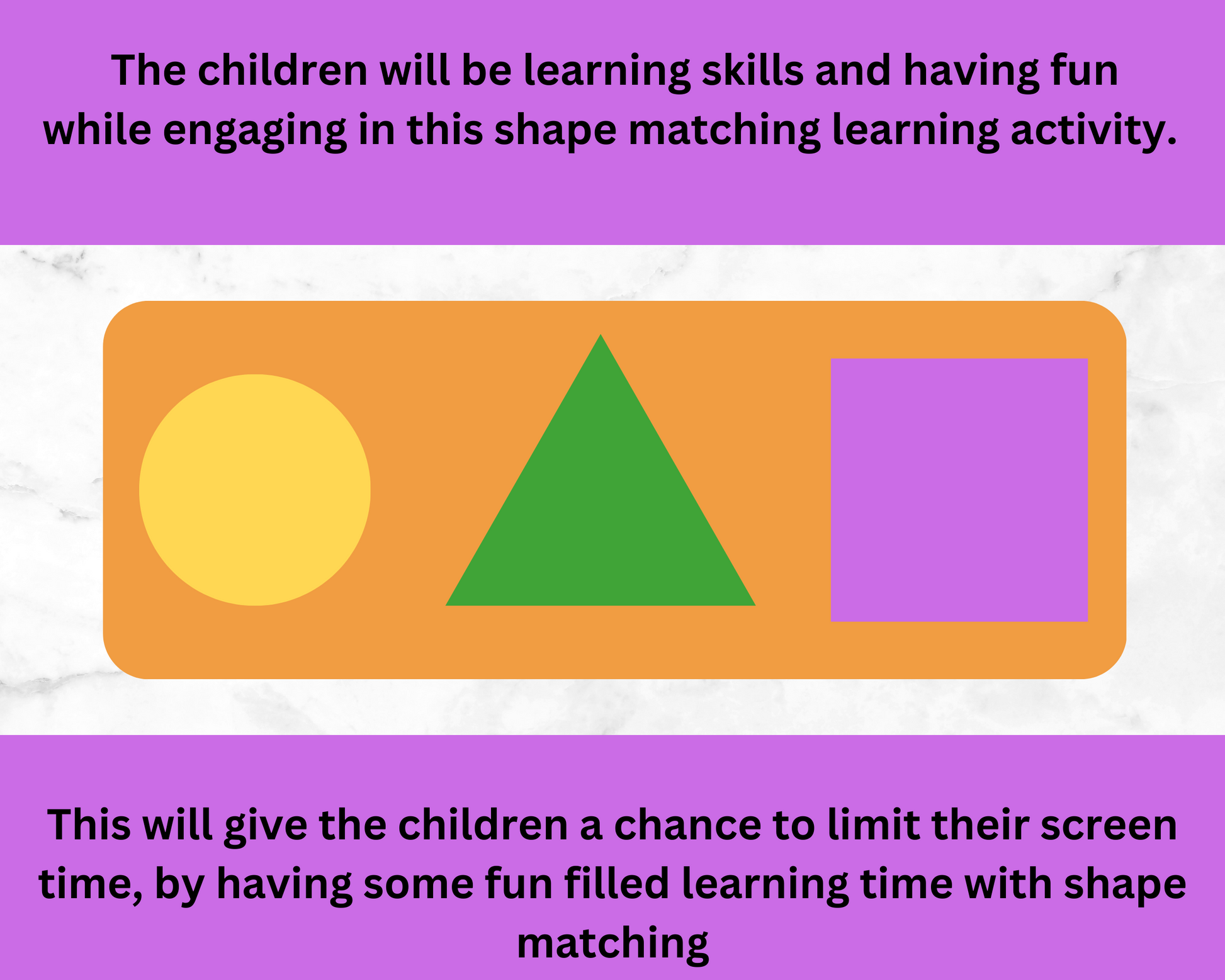 Once you print out your shape matching board, for extra support/thickness attach another cardstock on the back or attach cardboard, posterboard or any other solid backing. You may even be able to hang the board up on a wall and have the children attach the matching shapes with some form of sticking mechanism like double sided tape or push pin. You can also put the two boards together, ex: top and bottom or side to side and tape it on the back, so it will be one board or put them together without the tape.
