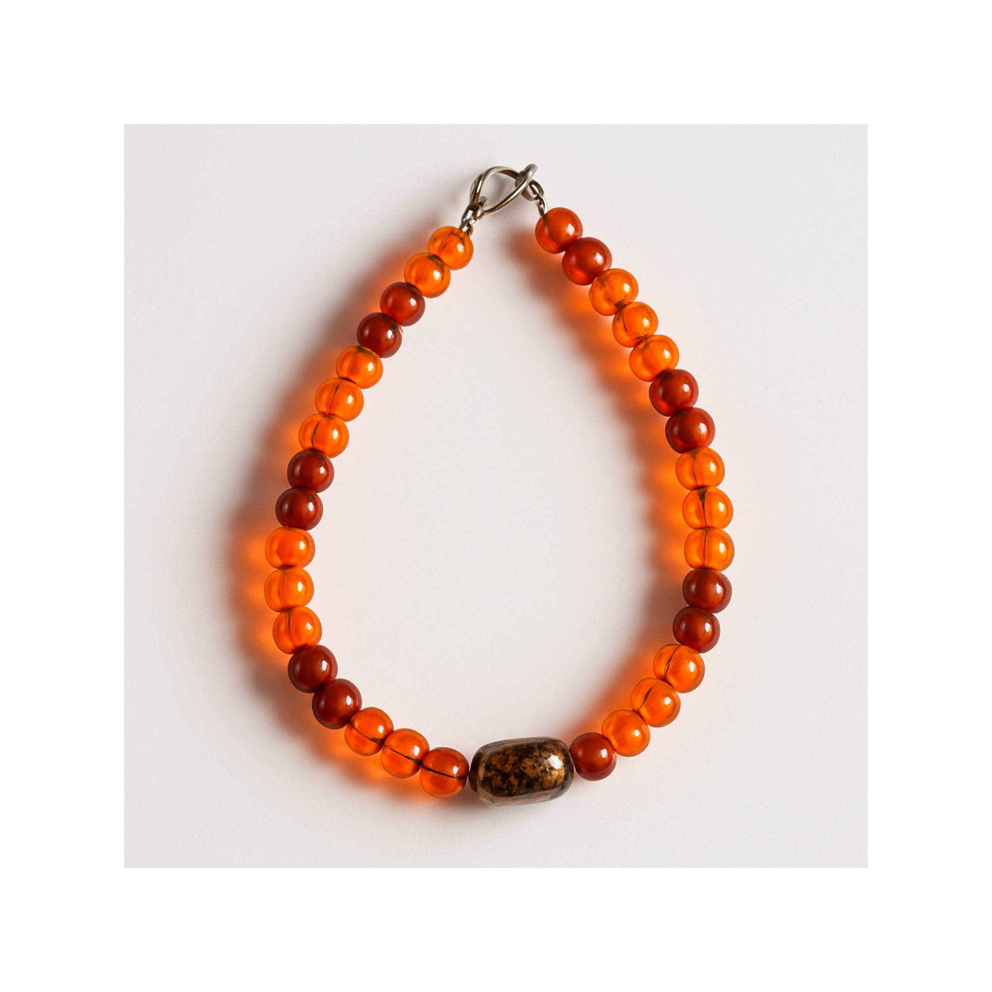 This vibrant bracelet features a single strand of bright orange elements accented with a few small gold toned elements for a touch of shine. At the center sits a striking dark cat shaped charm with a beautiful marble like finish, giving the piece a unique and playful focal point. The bracelet is finished with a simple metal hook clasp, making it easy to wear. A fun yet stylish accessory that adds personality to any outfit.